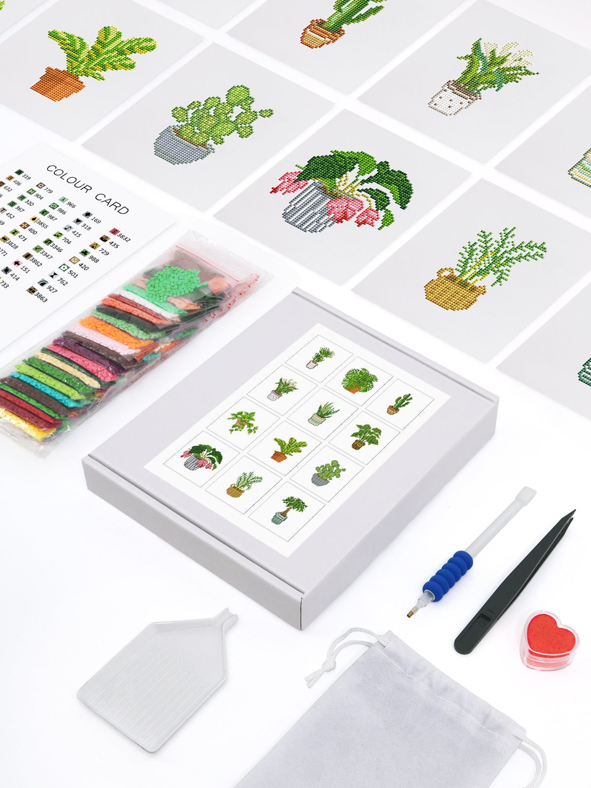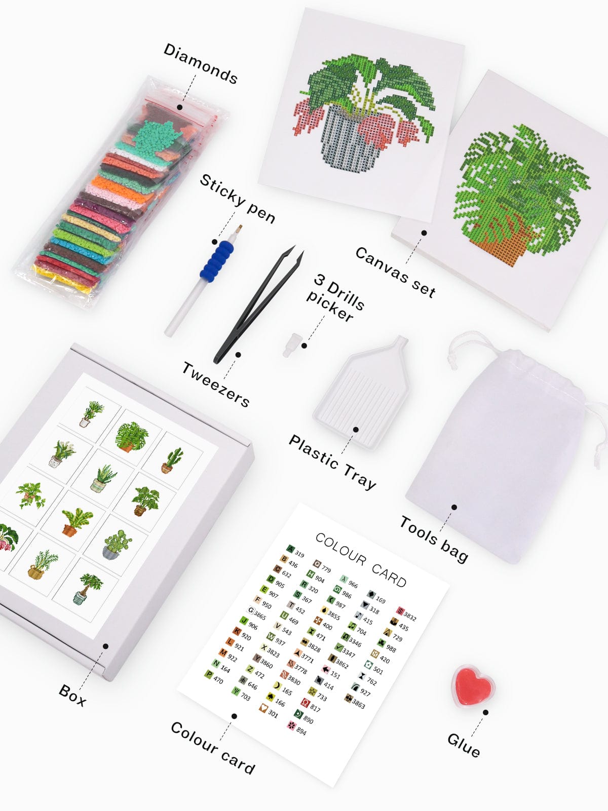 - 12 Frameless Numbered Canvases (6 x 7 inches / 15 x 18 cm each) with a painting size of 3 x 5 inches / 8 x 12 cm each featuring vibrant green plant designs