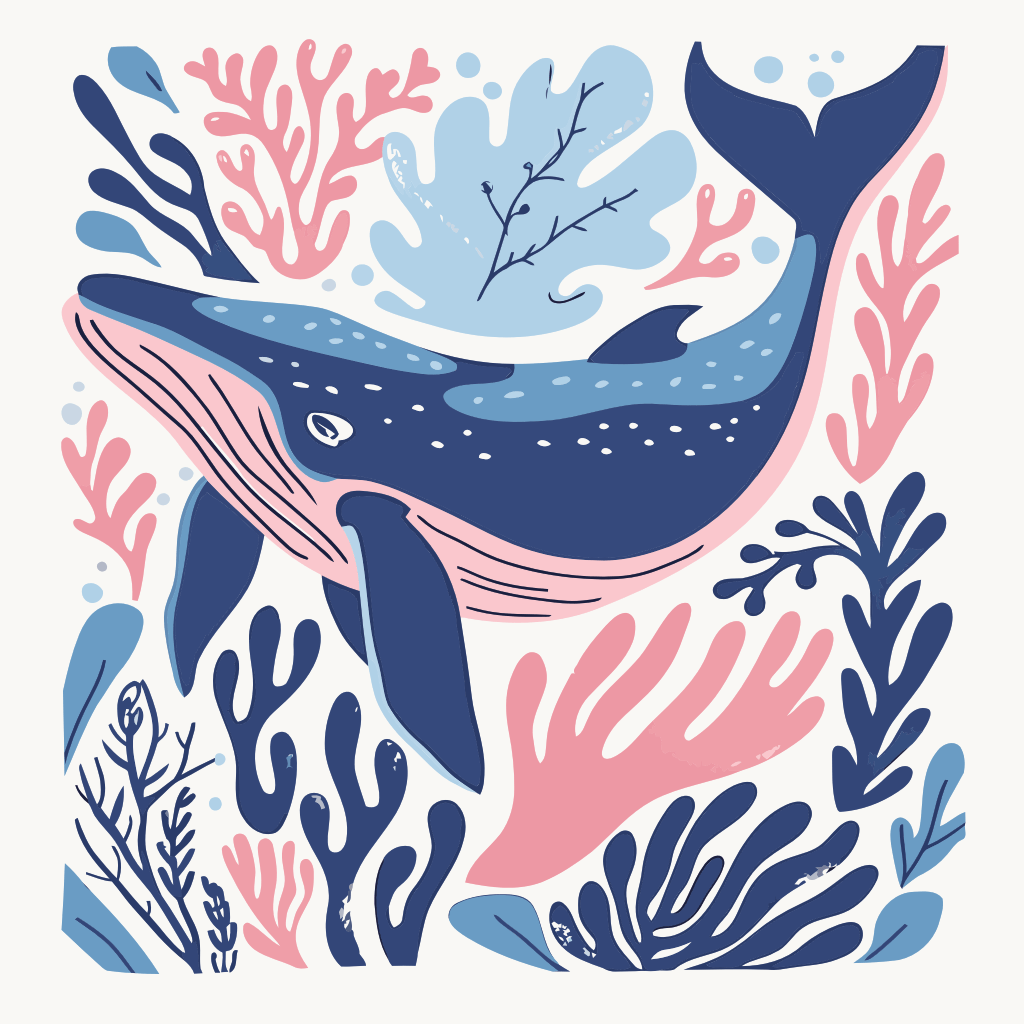 This beautiful artwork features a graceful whale swimming through a vibrant seascape of corals and sea plants in soothing hues of blue and pink.