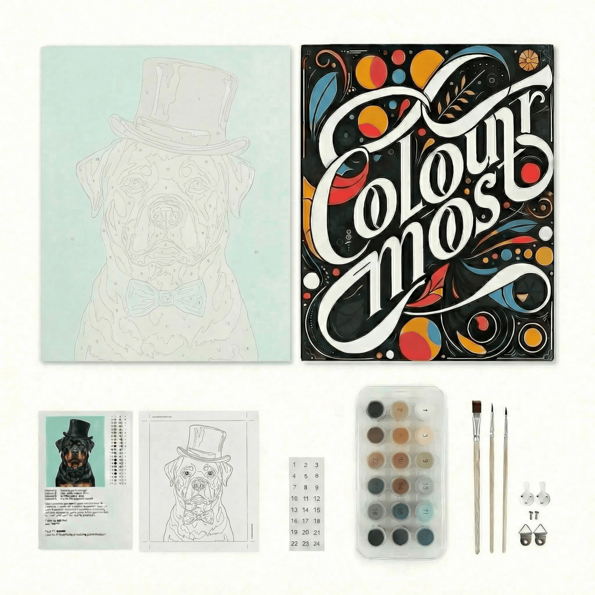 Open your kit and lay out the canvas flat. Match each numbered paint pot to the reference guide. No water needed — paints are ready to use!