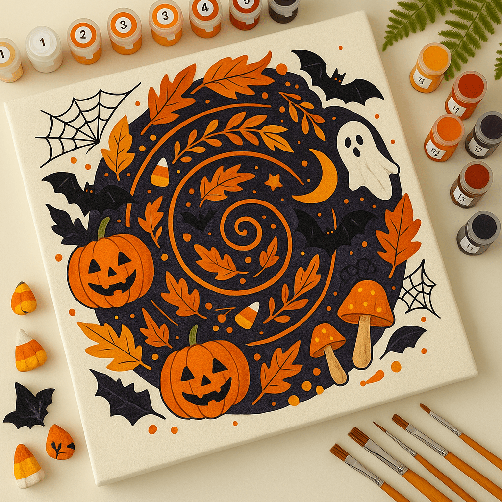 This DIY paint-by-numbers kit brings Halloween to life with pumpkins, bats, and ghosts! Perfect for stress relief and festive fun.